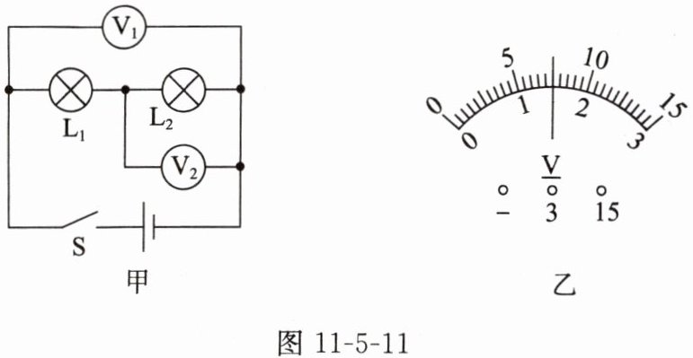 8. 如图11 - 5 - 11甲所示的电路中,当开关S闭合后,两电压表的指针偏转均如图11 - 5 - 11乙所示,则灯泡$L_1$两端的电压为