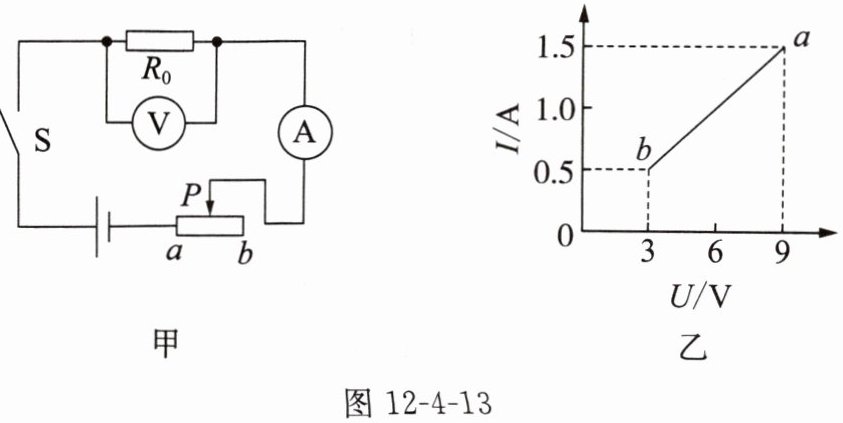 7. 如图12-4-13甲所示的电路中,电源电压保持不变,闭合开关后,滑动变阻器的滑片$P由b端移到a$端,电流表的示数$I与电压表的示数U$的变化关系如图12-4-13乙所示,则电源电压为______$\mathrm{V}$,定值电阻$R_{0}$的阻值是______$\Omega$,滑动变阻器的最大阻值是______$\Omega$。