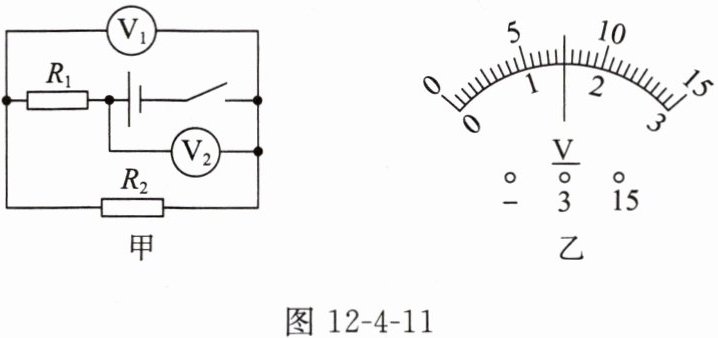 5. 如图12-4-11甲所示的电路中,闭合开关后,两只电压表的指针偏转均如图12-4-11乙所示,则$R_{1}$两端的电压是______$\mathrm{V}$,$R_{2}$两端的电压是______$\mathrm{V}$,通过$R_{1}与R_{2}$的电流之比为______,$R_{1}与R_{2}$的电阻之比为______。