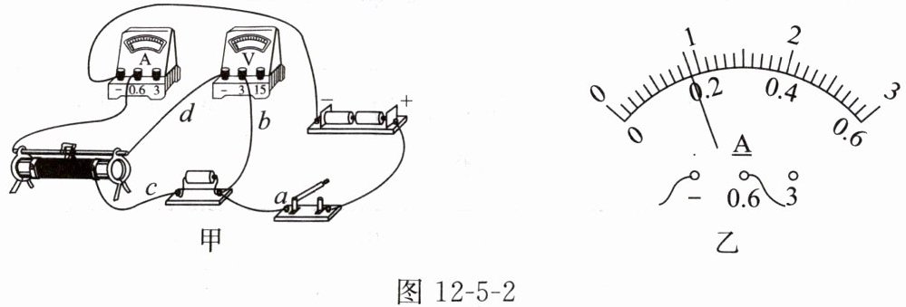(选填“a”“b”“c”或“d”)。(3)纠正错误后,闭合开关,测得的几组数据如下表所示。第3次实验时电流表的示数如图12-5-2乙所示,电流表的示数为
