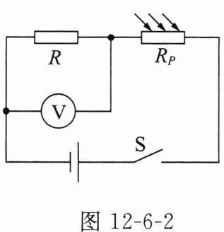 1. 图 12-6-2 是一款摄像机自主启动装置的简化电路图,电源电压为 $ 12\ V $。$ R_{P} $是红外线探测电阻;$ R $是定值电阻,阻值为 $ 8\ \Omega $。闭合开关 $ S $后,当 $ R $两端的电压达到 $ 8\ V $时,摄像机自主启动拍摄,则此时电路中的电流为______A,$ R_{P} $的阻值为______Ω。