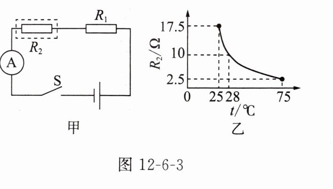 2. 某兴趣小组在查阅了半导体材料的相关信息后,设计了如图 12-6-3 甲所示的电路,现想将电流表(选用 $ 0\sim0.6\ A $的量程)改为温度表,其中 $ R_{2} $为多种半导体材料混合制成的电阻,其阻值随温度变化的关系如图 12-6-3 乙所示。现闭合开关 $ S $,并将 $ R_{2} $置于 $ 25^{\circ}C $的某温箱中,电流表的示数恰为 $ 0.2\ A $。若此电路所能测量的最高温度为 $ 75^{\circ}C $,则: