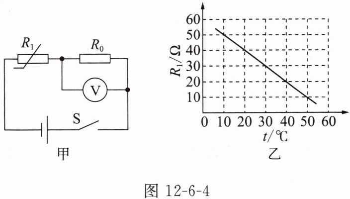 3. 某同学利用热敏电阻设计了如图 12-6-4 甲所示的电路,用来实时监测某一环境的温度,已知电源电压不变,定值电阻 $ R_{0}= 20\ \Omega $,$ R_{1} $是热敏电阻,其阻值随温度变化的关系图像如图 12-6-4 乙所示。