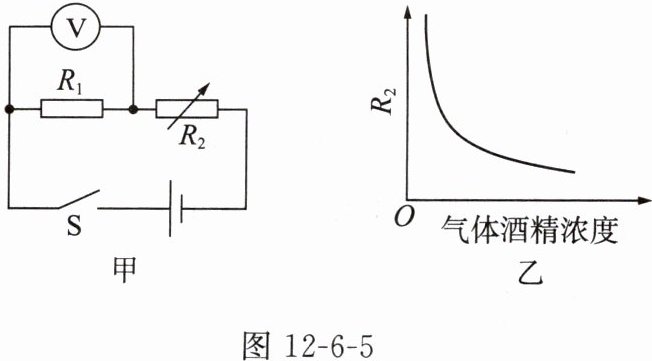 1. 交管部门定期开展交通违法专项治理行动。图 12-6-5 甲是查处酒驾行为时使用的某酒精测试仪的工作原理图,电源电压恒定,$ R_{1} $为定值电阻,$ R_{2} $为气敏电阻,其阻值随气体酒精浓度变化的情况如图 12-6-5 乙所示。闭合开关 $ S $,下列说法正确的是(