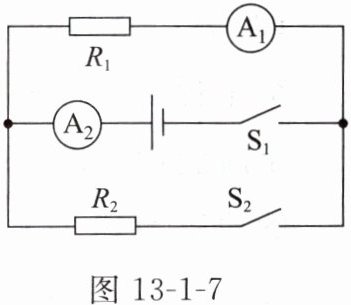 5. 如图 13 - 1 - 7 所示的电路中,电源电压不变,电阻$R_{1}的阻值为20\Omega$。只闭合开关$S_{1}$,电流表$A_{1}$的示数为 0.3 A。