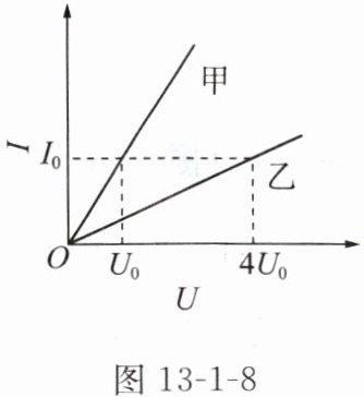 6. 图 13 - 1 - 8 是甲、乙两个定值电阻的电流与电压的关系图像,根据图像可得甲、乙的电阻之比$R_{甲}:R_{乙}=$