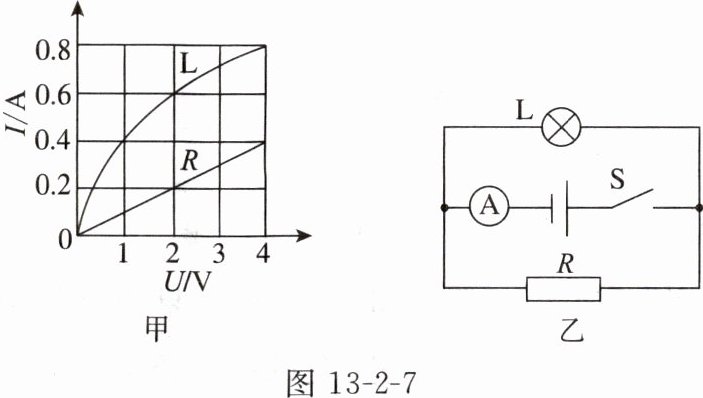 6. 图13-2-7甲为分别测量小灯泡$L和定值电阻R的电流与电压后得到的I-U$图像。把小灯泡$L和定值电阻R接在电源电压为2\ V$的电路中,如图13-2-7乙所示,则$R$的阻值为