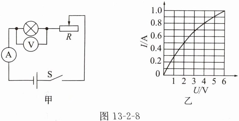 2. 如图13-2-8甲所示的电路中,电源电压为$9\ V$且保持不变,小灯泡标有“$6\ V\ \ 6\ W$”的字样,小灯泡的电流与电压的关系如图13-2-8乙所示。下列说法正确的是(