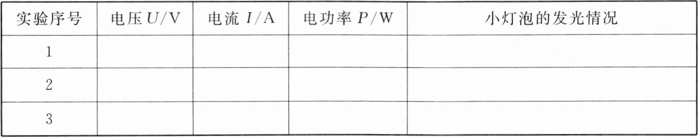 实验序号 电压$U/V$ 电流$I/A$ 电功率$P/W$ 小灯泡的发光情况