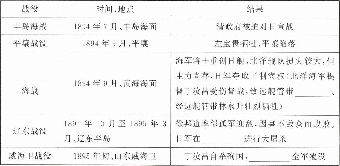 (1)背景:日本对朝鲜觊觎已久,征服朝鲜是日本企图侵略中国、称霸世界的重要步骤。1894年,朝鲜发生__________。应朝鲜国王请求,清政府派兵帮助镇压。日本也乘机出兵朝鲜。起义平息后,日本继续增兵朝鲜,蓄意挑起战争。
