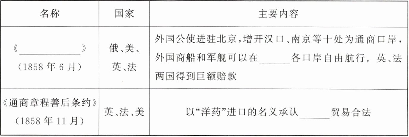 2. 经过:1856 年 10 月,英军炮轰____,挑起战争。次年,英国和法国联合出兵,攻陷广州,并对广州实施军事管制。1858 年 4 月,英法联军舰队北上,攻陷____,逼近天津。美、俄两国舰队借口调停,也跟随北上。