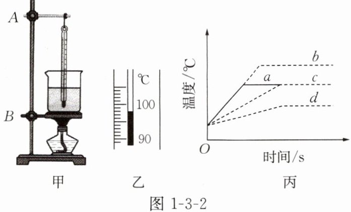 2. 图1-3-2甲是“探究水在沸腾前后温度变化的特点”的实验装置,图1-3-2乙是水沸腾时温度计的示数,图1-3-2丙中的a是根据实验数据绘制的温度随时间变化的关系图像。下列分析正确的是(