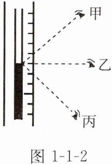 7. 如图1-1-2所示,温度计的刻度线与玻璃管中的液柱存在一小段距离,所以读取示数时如果视线与温度计的角度不正确,就得不到正确的数据。图1-1-2中甲、乙、丙三种读数方法正确的是