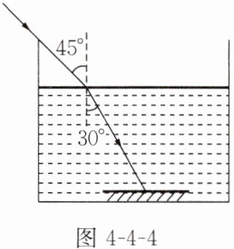 4. 如图 4 - 4 - 4 所示,光从空气射入某液体中,入射角为 45°,折射角为 30°。光射到液体底部放置的平面镜上发生了反射,最后光又回到空气中,这时折射角为(
