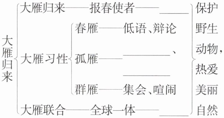 大雁归来{大雁习性{春雁——低语、辩论 孤雁——____、____ 群雁——集会、喧闹}