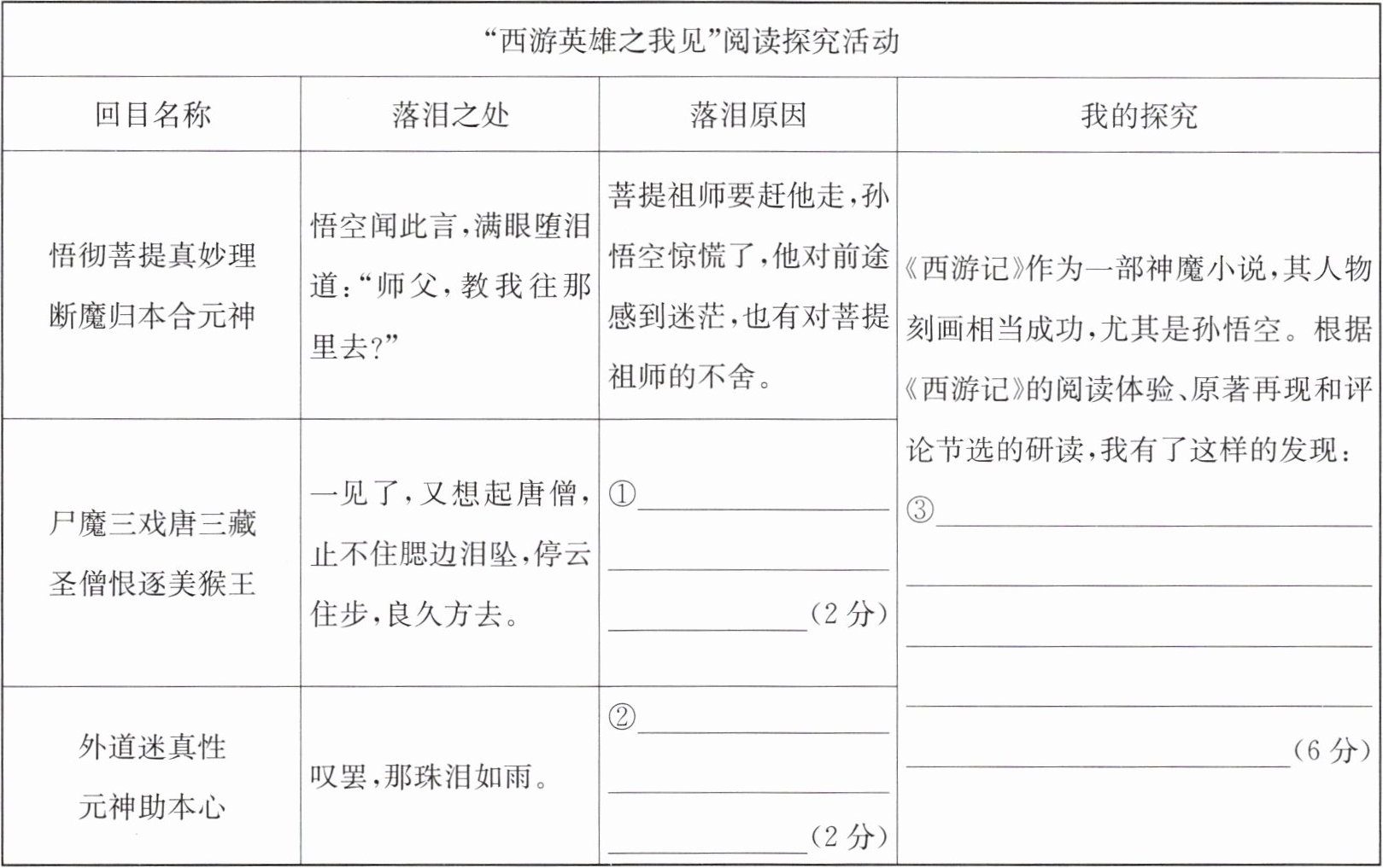2.【专题探究】在学校的读书节中,七年级(2)班进行了"西游英雄之我见"阅读探究活动。某小组设计了如下阅读表格,以帮助同学更好地阅读名著,请你参与。(10分)
