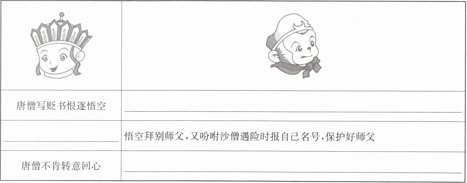 1.悟空接贬书决定离开,却又软款要求拜别师父 唐僧转身不睬,不受礼 悟空无奈离去(每空1分) 2.