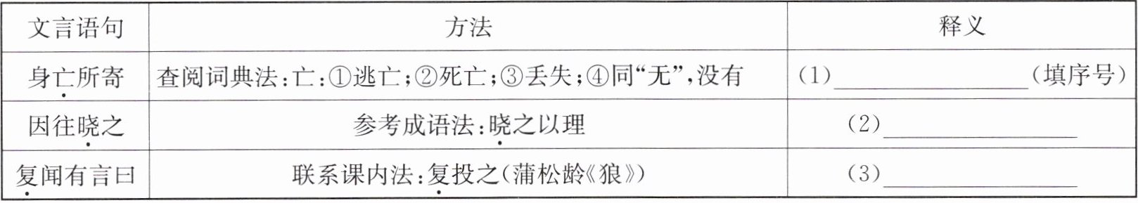 | 复闻有言曰 | 联系课内法:复投之(蒲松龄《狼》) | (3)______ |