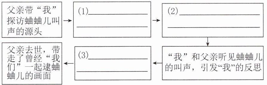 父亲带“我”探访蛐蛐儿叫声的源头→(1)______→(2)______→“我”和父亲听见蛐蛐儿的叫声,引发“我”的反思→父亲去世,带走了曾经“我”和他一起逮蛐蛐儿的画面→(3)______