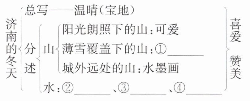 济南的冬天{总写——温晴(宝地) 分述{山{阳光朗照下的山:可爱 薄雪覆盖下的山:① 城外远处的山:水墨画 水:②、③、④} 喜爱 赞美}