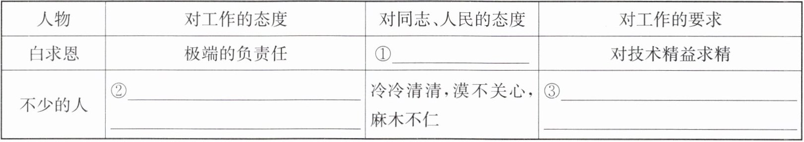 |白求恩|极端的负责任|①______|对技术精益求精|