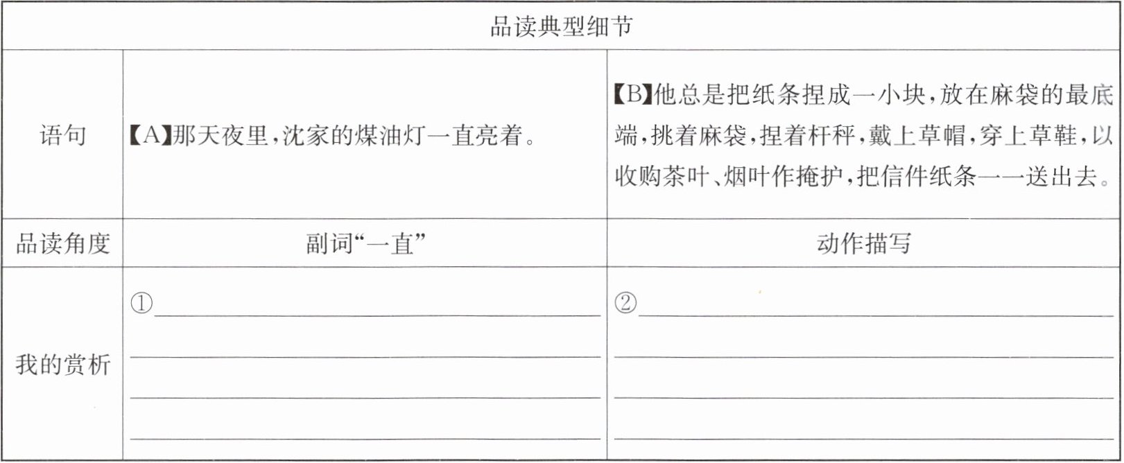 |品读典型细节|语句|【A】那天夜里,沈家的煤油灯一直亮着。【B】他总是把纸条捏成一小块,放在麻袋的最底端,挑着麻袋,捏着杆秤,戴上草帽,穿上草鞋,以收购茶叶、烟叶作掩护,把信件纸条一一送出去。|