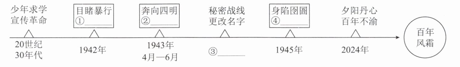 少年求学宣传革命→目睹暴行①______→奔向四明②______→秘密战线更改名字→身陷囹圄④______→夕阳丹心百年不渝