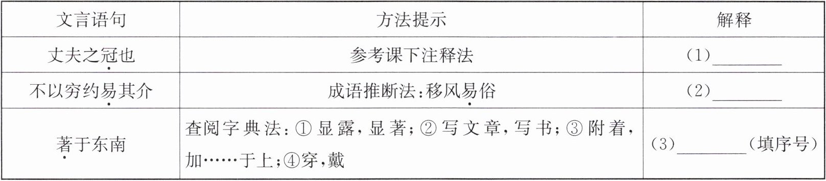 |著于东南|查阅字典法:①显露,显著;②写文章,写书;③附着,加……于上;④穿,戴|(3)______(填序号)|
