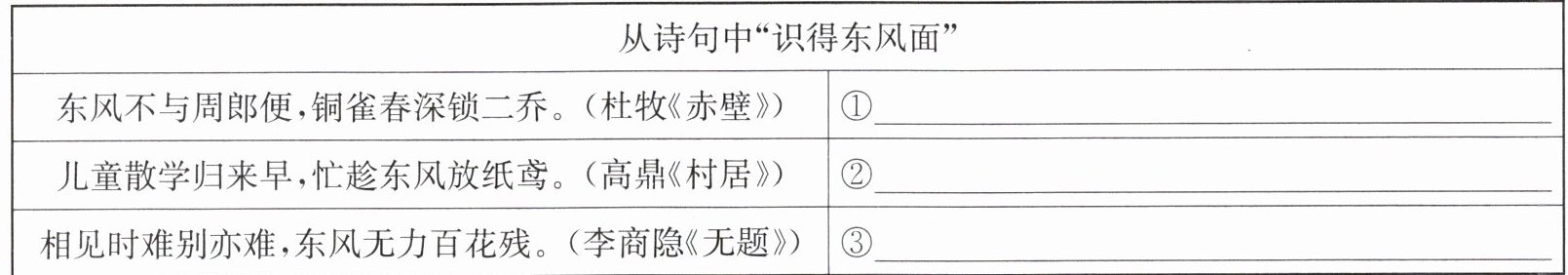 | 东风不与周郎便,铜雀春深锁二乔。(杜牧《赤壁》) | ①______ |