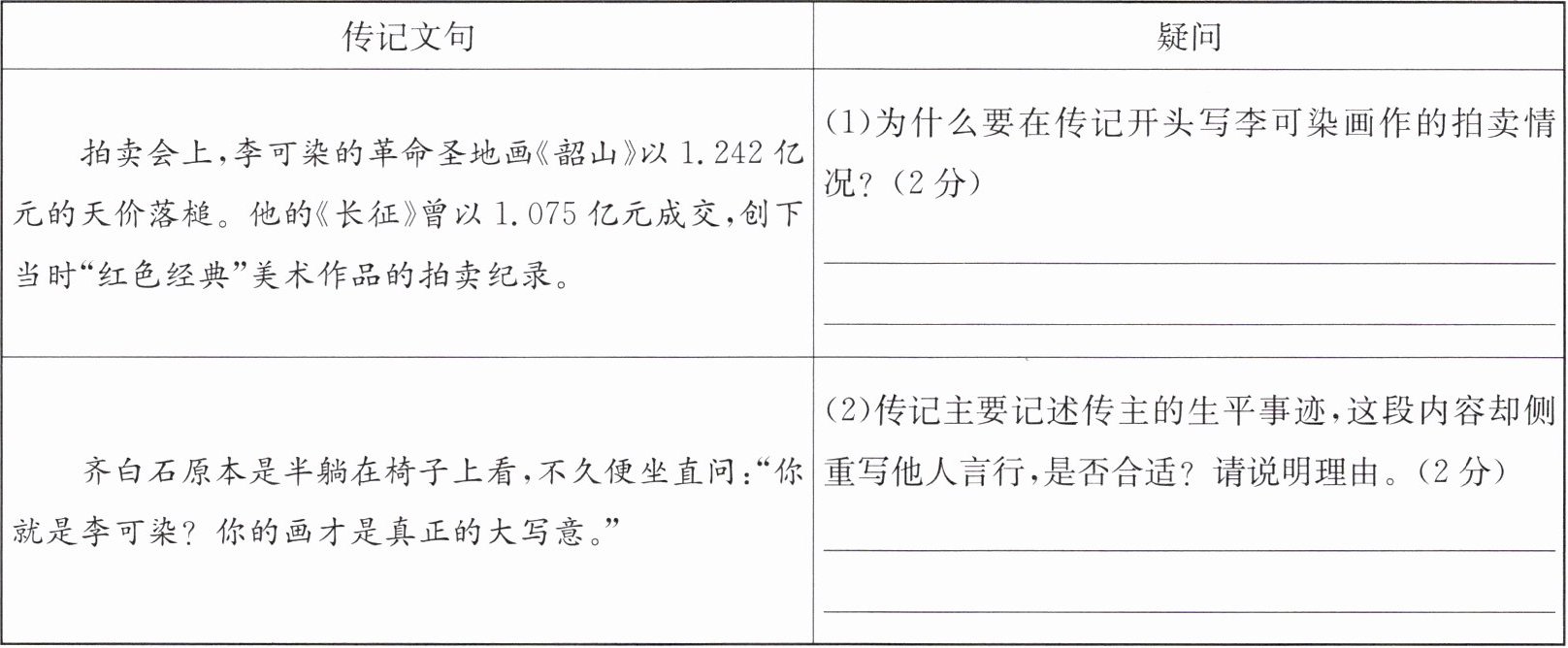 | 拍卖会上,李可染的革命圣地画《韶山》以1.242亿元的天价落槌。他的《长征》曾以1.075亿元成交,创下当时“红色经典”美术作品的拍卖纪录。 | (1)为什么要在传记开头写李可染画作的拍卖情况?(2分) |