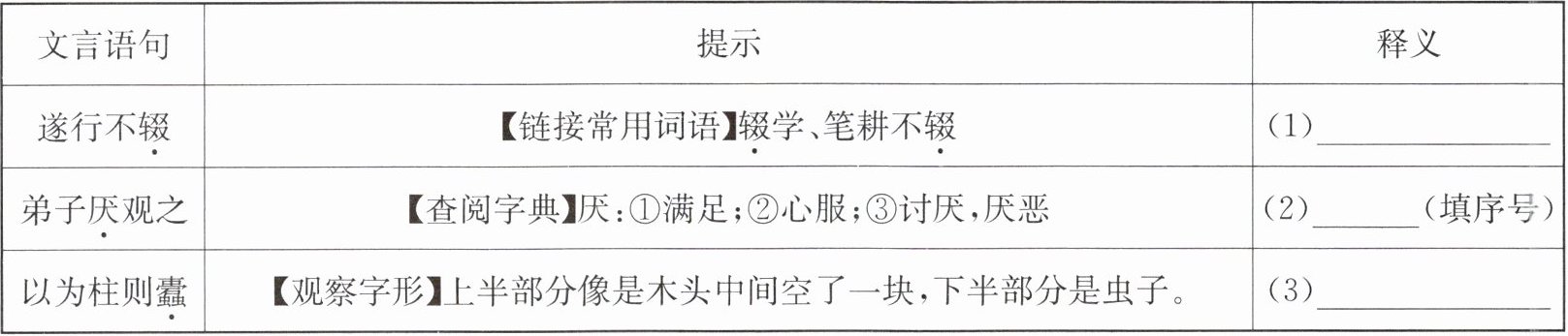 | 弟子厌观之 | 【查阅字典】厌:①满足;②心服;③讨厌,厌恶 | (2)______(填序号) |