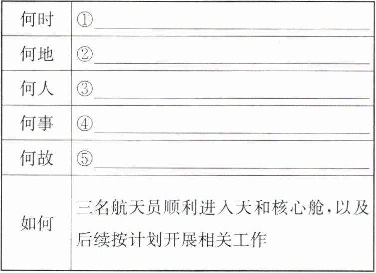 ①2021年6月17日9时22分 ②酒泉卫星发射中心 ③航天员聂海胜、刘伯明、汤洪波 ④神舟十二号载人飞船发射升空,准确进入预定轨道,顺利将三名航天员送上太空 ⑤航天领域要验证航天员长期在轨驻留、再生生保等一系列关键技术