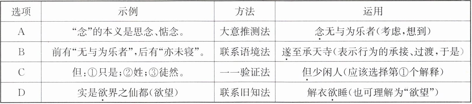 | B | 前有“无与为乐者”,后有“亦未寝”。 | 联系语境法 | 遂至承天寺(表示行为的承接、过渡,于是) |