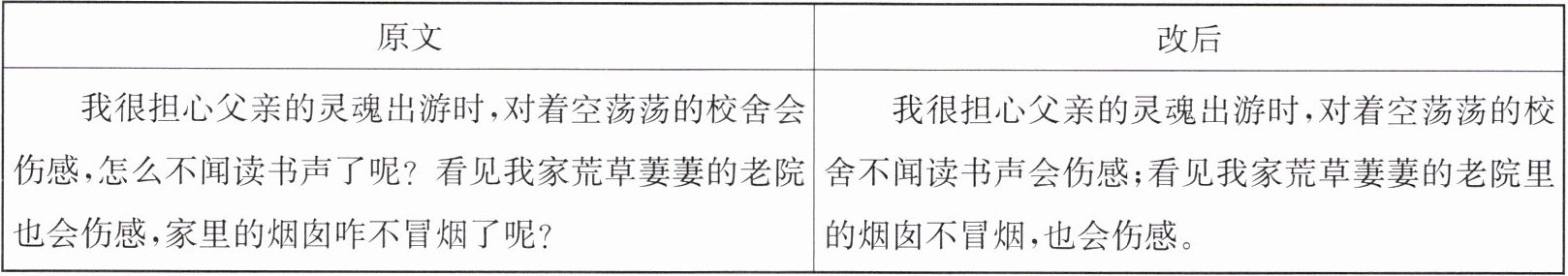 |我很担心父亲的灵魂出游时,对着空荡荡的校舍会伤感,怎么不闻读书声了呢?看见我家荒草萋萋的老院也会伤感,家里的烟囱咋不冒烟了呢?|我很担心父亲的灵魂出游时,对着空荡荡的校舍不闻读书声会伤感;看见我家荒草萋萋的老院里的烟囱不冒烟,也会伤感。|
