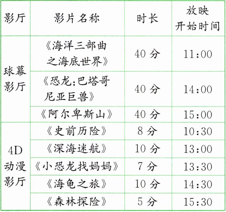 2. 下表是某科技馆周日影厅放映时刻表。