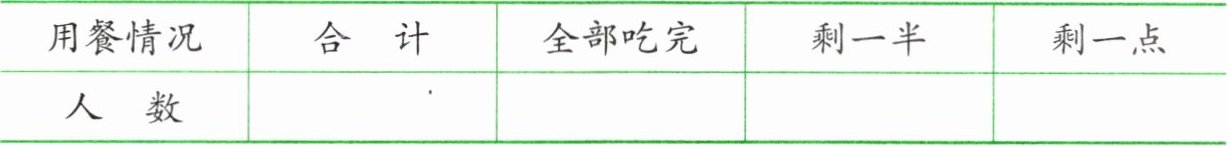 | 用餐情况 | 合 计 | 全部吃完 | 剩一半 | 剩一点 |