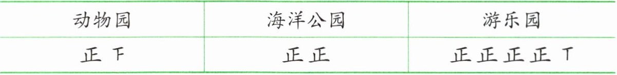 海洋公园:2个“正”字,表示 $5× 2 = 10$(人)。