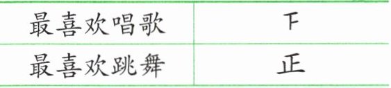 已知小奇记录中“最喜欢唱歌”对应的是“下”,即表示最喜欢唱歌的有$4$人;“最喜欢跳舞”对应的是“正”,即表示最喜欢跳舞的有$5$人。