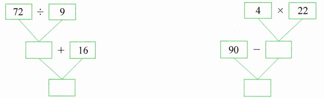 故答案为:8,24,$72 ÷ 9 + 16 = 24$;88,2,$90 - 4 × 22 = 2$。