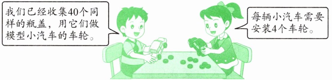 已知每辆小汽车需要安装$4$个车轮,要安装$9$辆小汽车,则总共需要的瓶盖数为:$9×4 = 36$(个)