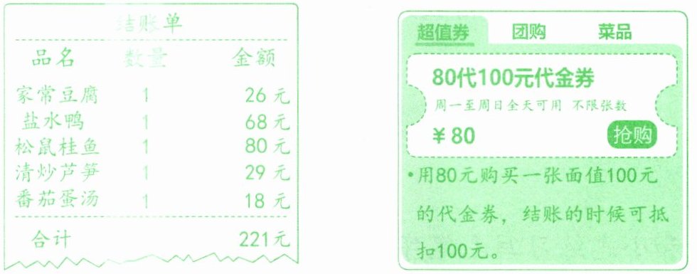 7. 琪琪一家去餐厅就餐,结账单如下,结账前他们购买了2张代金券。
