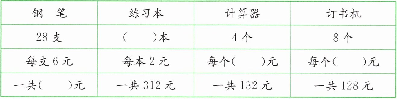 钢笔的数量是$28$支,每支$6$元,根据$总价 = 单价×数量$,可得钢笔的总价为$28×6 = 168$(元)。