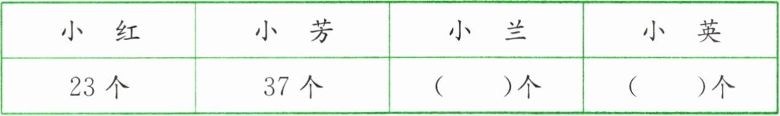 3. 小朋友们折纸鹤,小红折了23个,小芳折了37个,小兰折的纸鹤个数比小红和小芳的总数还多2个,小英折的纸鹤个数是小红和小芳总数的2倍。根据这些条件把下表填写完整。