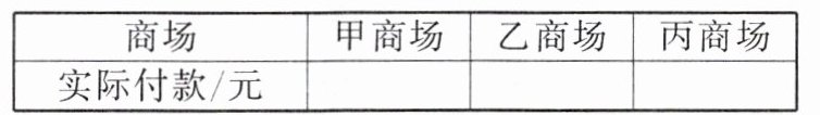 分析:(1)分别计算三个商场的实际付款额,甲商场:(290+270)×0.6= 336(元);乙商场:290+270-200= 360(元);丙商场:290-50×2+270-50×2= 360(元).选择费用最少的商场即可.(2)利用“甲、乙两商场实际付款额一样”这一等量关系,列出方程求解即可.