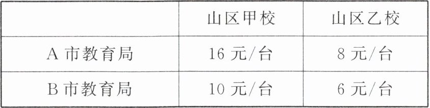 5. 为改善某山区两所学校的教学设备状况,A市教育局与B市教育局决定支援该山区学校一批电脑.A市教育局可支援电脑100台,B市教育局可支援电脑40台.现在决定给山区甲校80台,给山区乙校60台.每台电脑的运费如下表.若总运费为1600元,则A市教育局运往山区乙校的电脑为