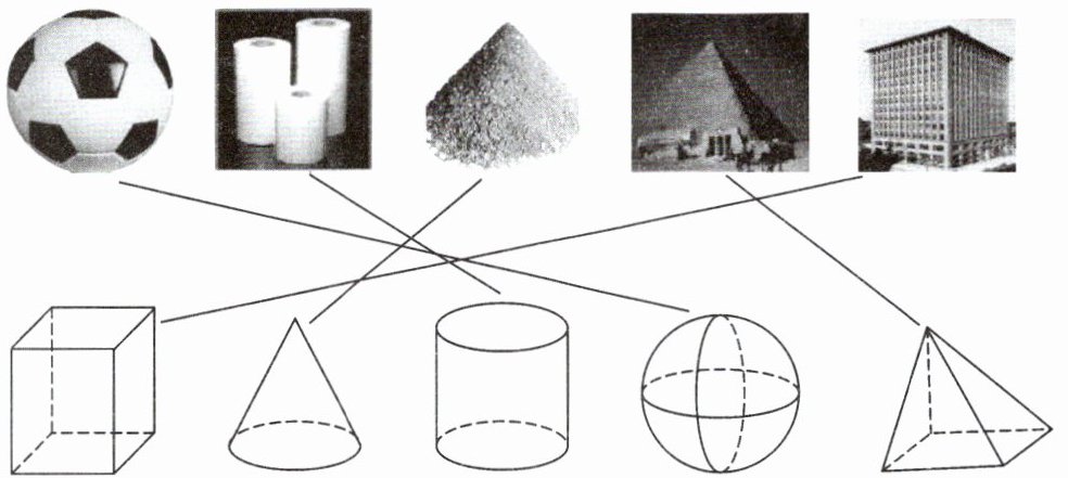 例 如下图所示,上面一行是一些具体的实物图形,下面一行是一些立体图形.试用线连接立体图形和对应的实物图形.