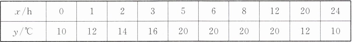 变式:为了防止蔬菜冻伤,蔬菜基地在大棚内安装并测试了恒温系统.恒温系统从开启到关闭,大棚内的温度$y$(单位:$^{\circ}C$)随时间$x$(单位:$h$)变化而变化的情况记录如下表.(恒温系统在0点开启,12点关闭)