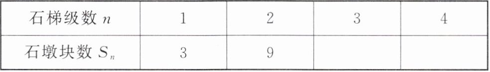 (1)第1级石梯中正方体石墩的块数为$\frac{3×1×(1+1)}{2}=3$;第2级石梯中正方体石墩的块数为$\frac{3×2×(2+1)}{2}=9$;第3级石梯中正方体石墩的块数为$\frac{3×3×(3+1)}{2}=18$;第4级石梯中正方体石墩的块数为$\frac{3×4×(4+1)}{2}=30$. 石梯级数n 1 2 3 4 石墩块数$S_{n}$ 3 9 18 30