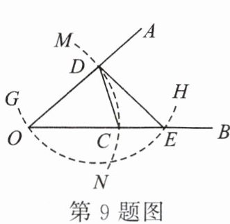 9.已知锐角$\angle AOB= 40^{\circ}$,如图,按下列步骤作图:①在$OA边取一点D$,以$O$为圆心,$OD长为半径画\overset{\frown}{MN}$,交$OB于点C$,连接$CD$.②以$D$为圆心,$DO长为半径画\overset{\frown}{GH}$,交$OB于点E$,连接$DE$.则$\angle CDE$的度数为( ).