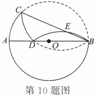 10.如图,$AB是\odot O$的直径,$BC是\odot O$的弦,先将$\overset{\frown}{BC}沿BC$翻折,交$AB于点D$.再将$\overset{\frown}{BD}沿AB$翻折,交$BC于点E$.若$\overset{\frown}{BE}= \overset{\frown}{DE}$,设$\angle ABC= \alpha$,则$\alpha$所在的范围是( ).